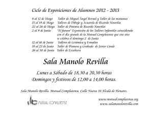 Desde el día 8 de Mayo hasta el día 30 de Junio de 2013 se podrán ver en la sala Manolo Revilla las Exposiciones de los distintos talleres que se han desarrollado este año en la Mutual Complutense.